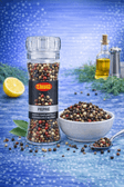 Vitana Спеції в млинку 4 перця 65 г- це універсальна суміш чотирьох видів перцю: чорного, білого, зеленого та рожевого, яка стане незамінною на будь-якій кухні. Завдяки скляному млинку зі зручним механізмом подрібнення, спеції зберігають свій аромат до моменту використання, даруючи стравам насичений, свіжий смак.